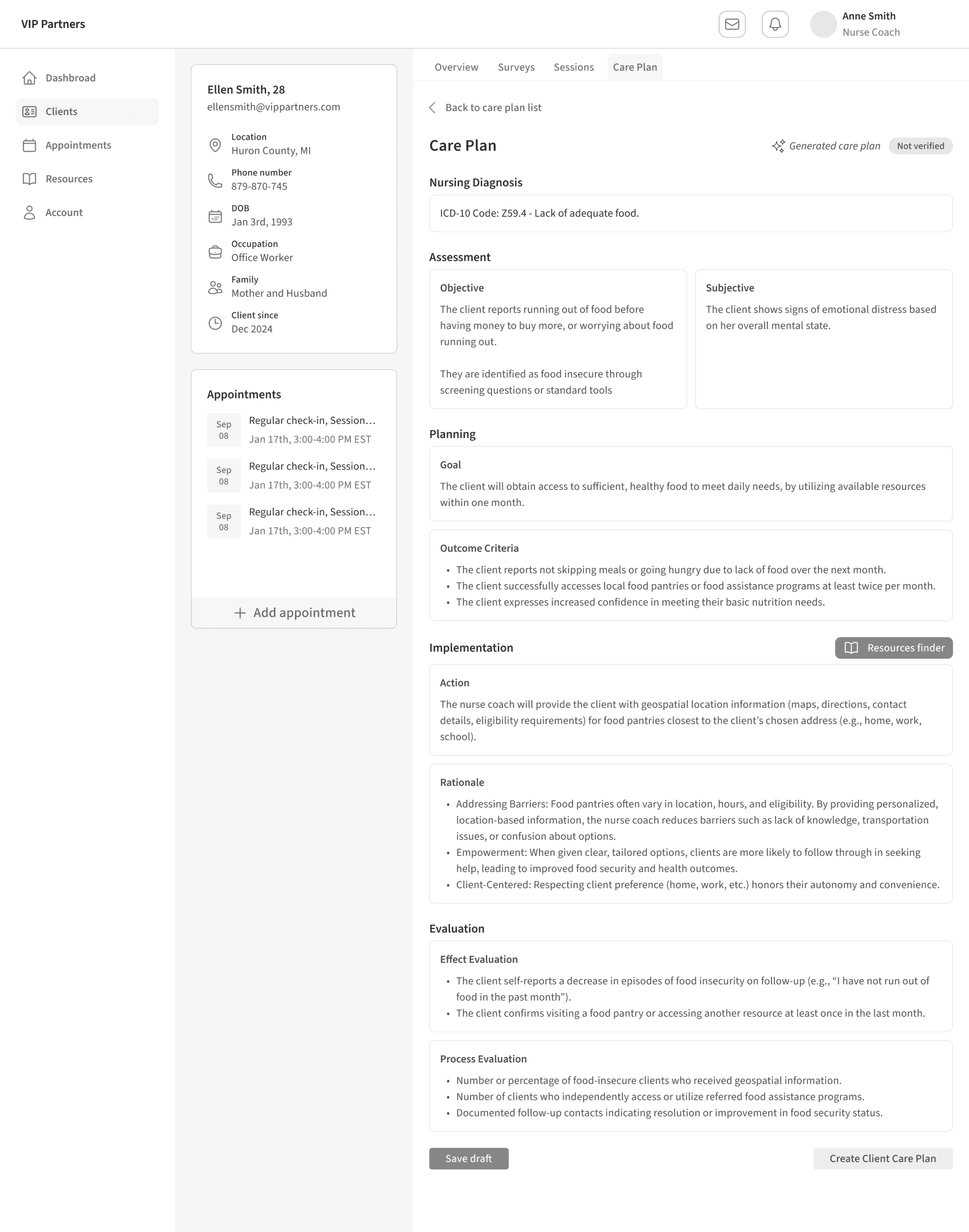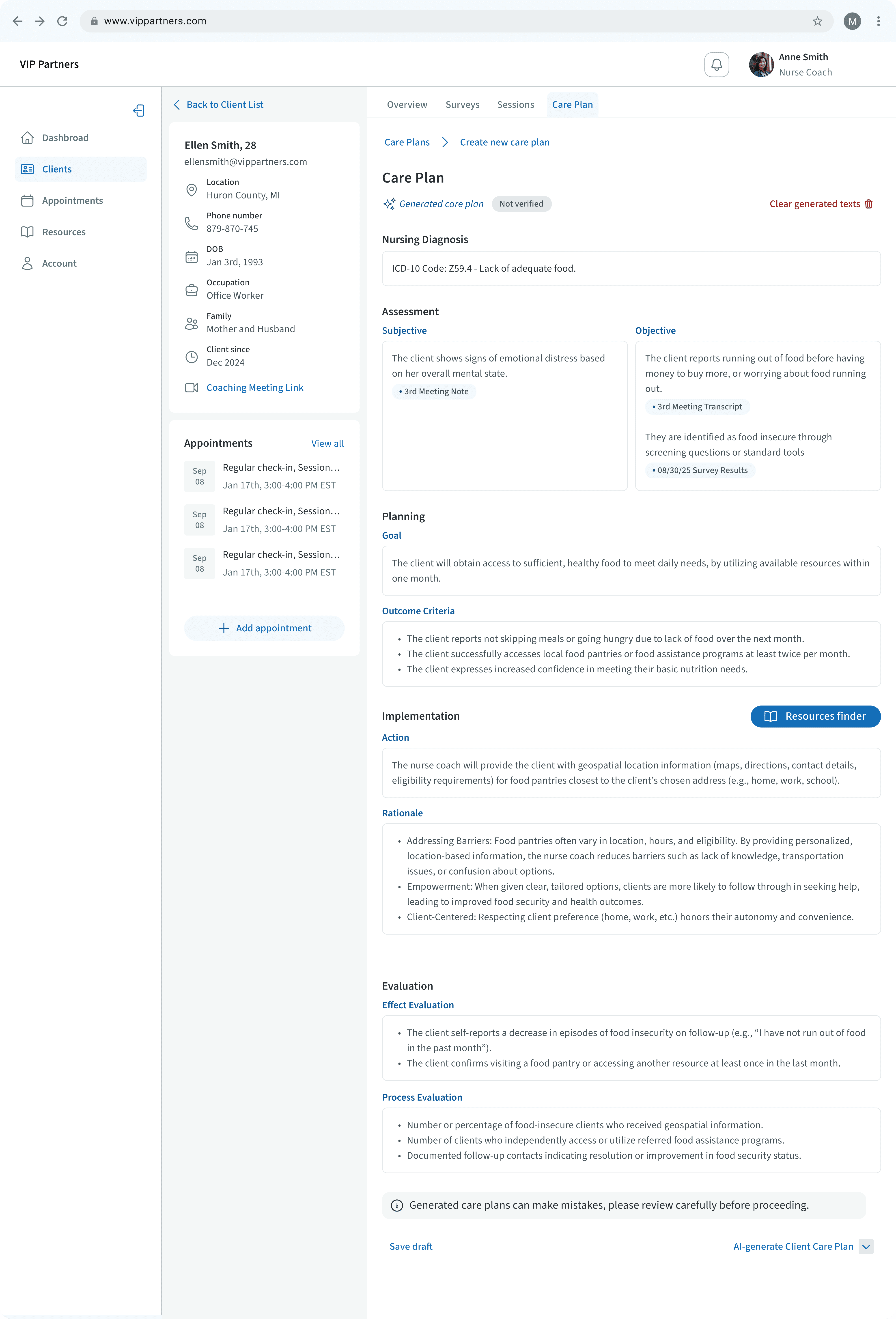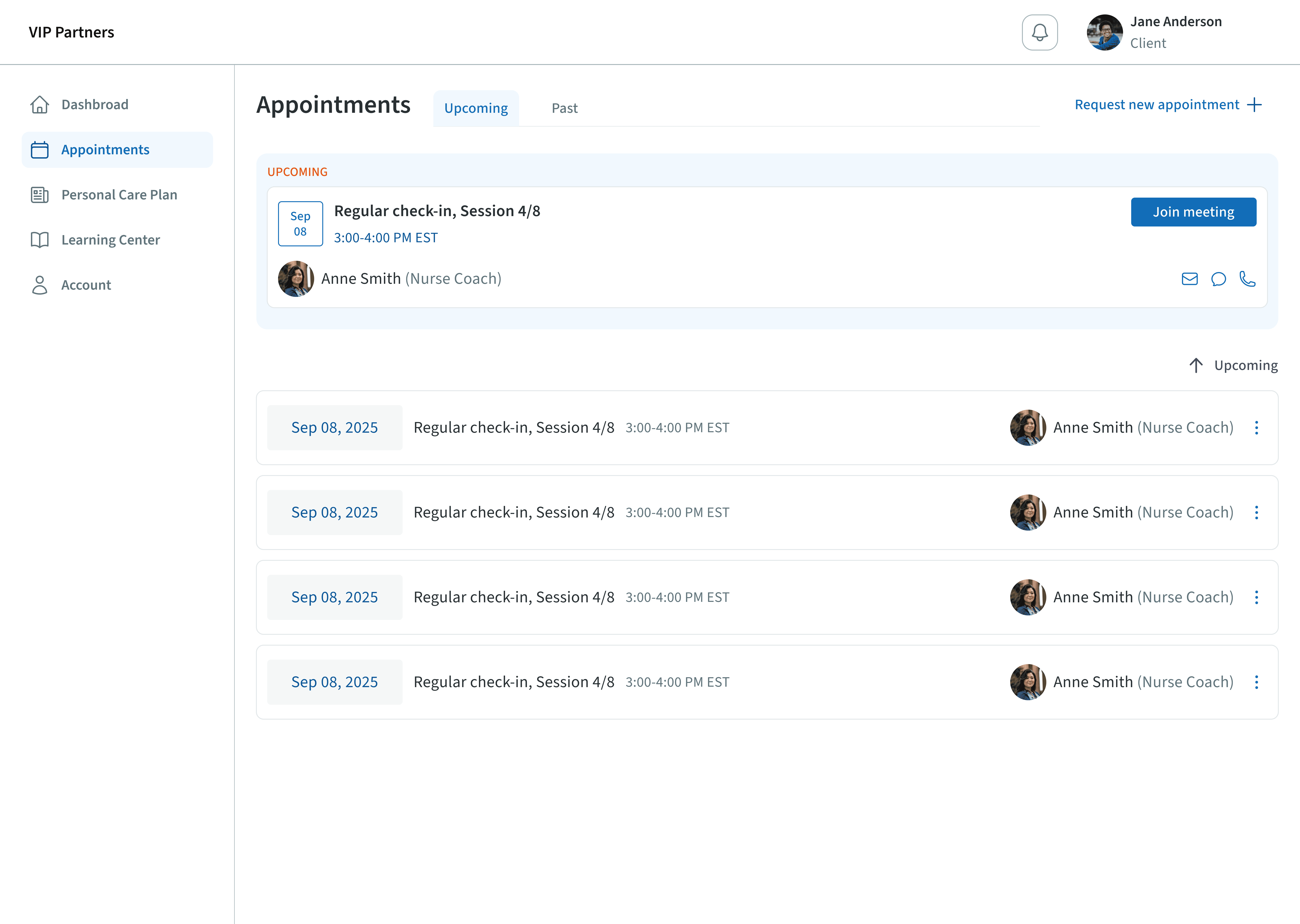 Clients can see a list of upcoming appoinments, and reschedule based on nurses' provided availability for health coaching.