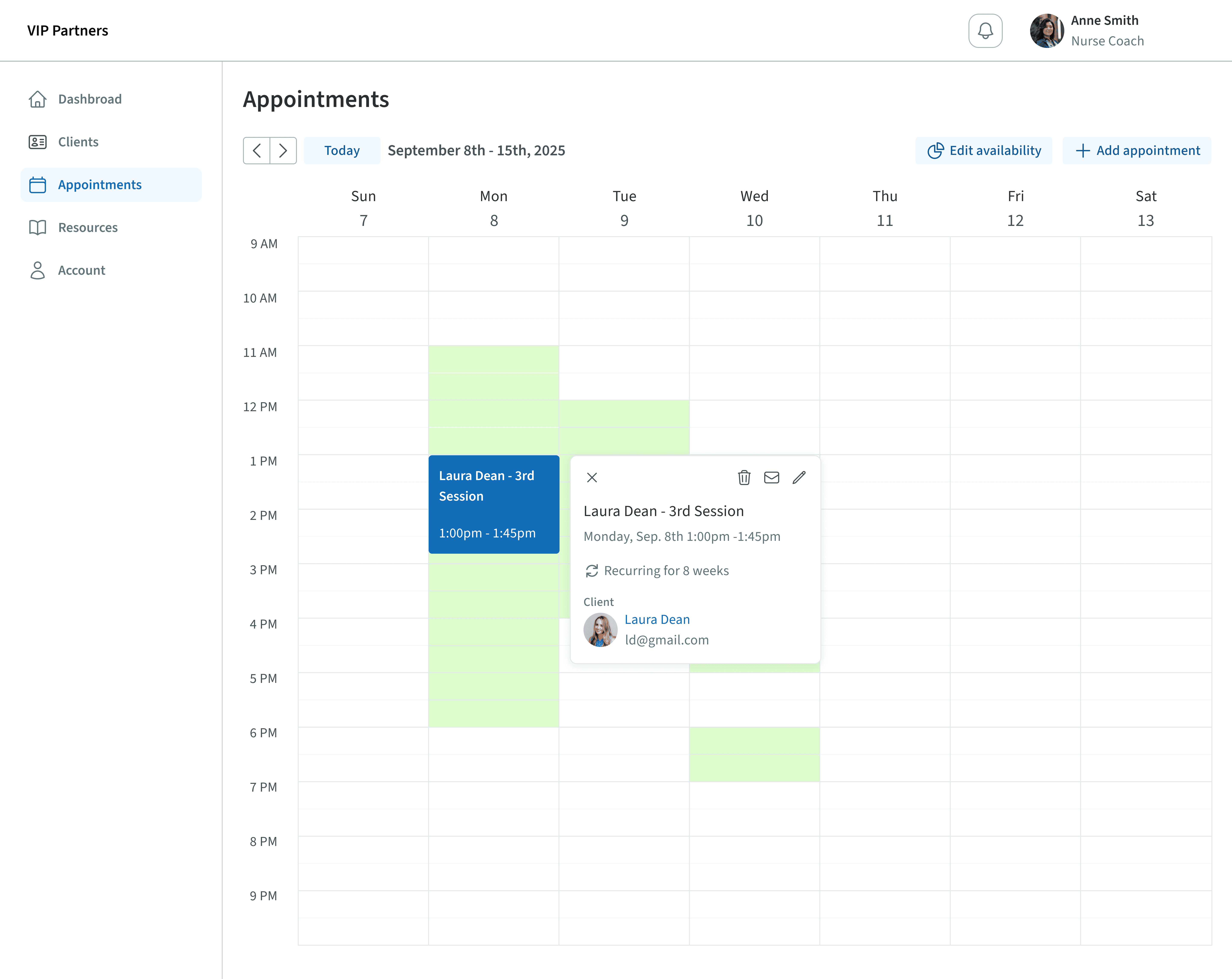 Nurses can set availability and recurring appoinments based on agreement with clients