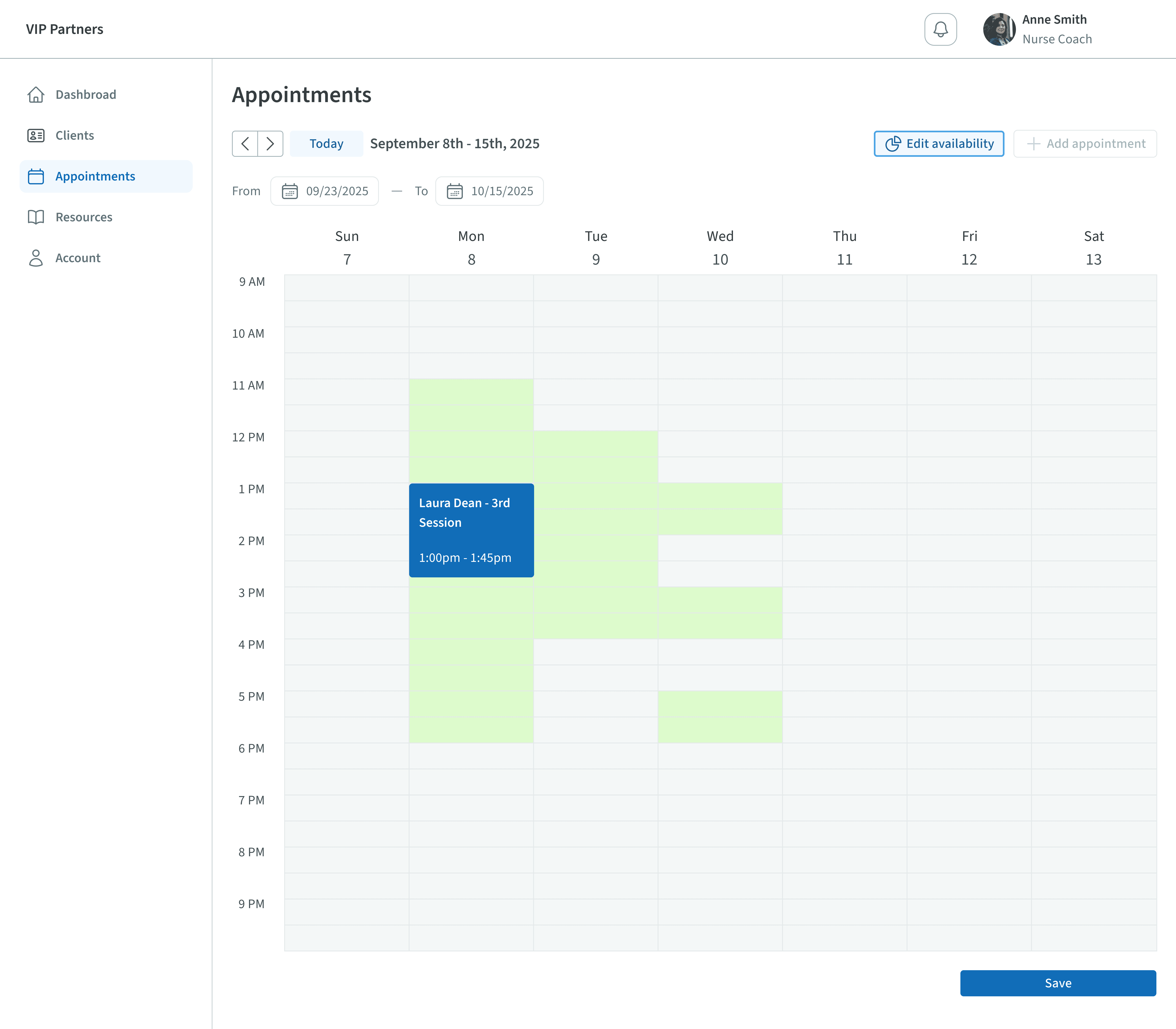 Nurses can go into editing mode to select and deselect the time slots they have available for nurse coaching.